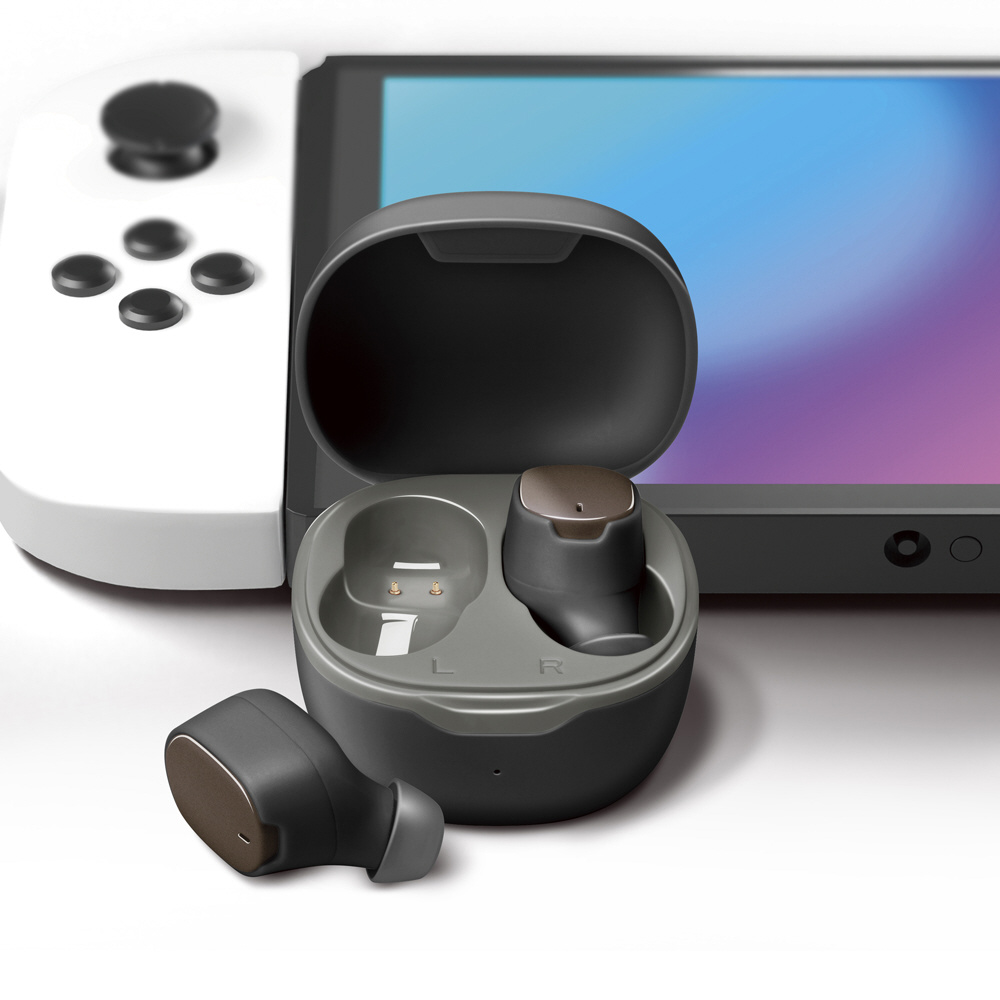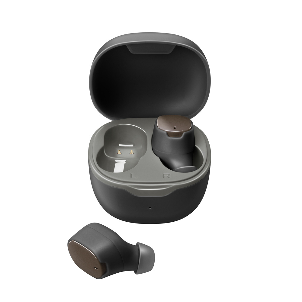 シックな2トーンカラーにメタリック加工が施された高級感のあるデザインの完全ワイヤレス ステレオイヤホン カナルタイプ