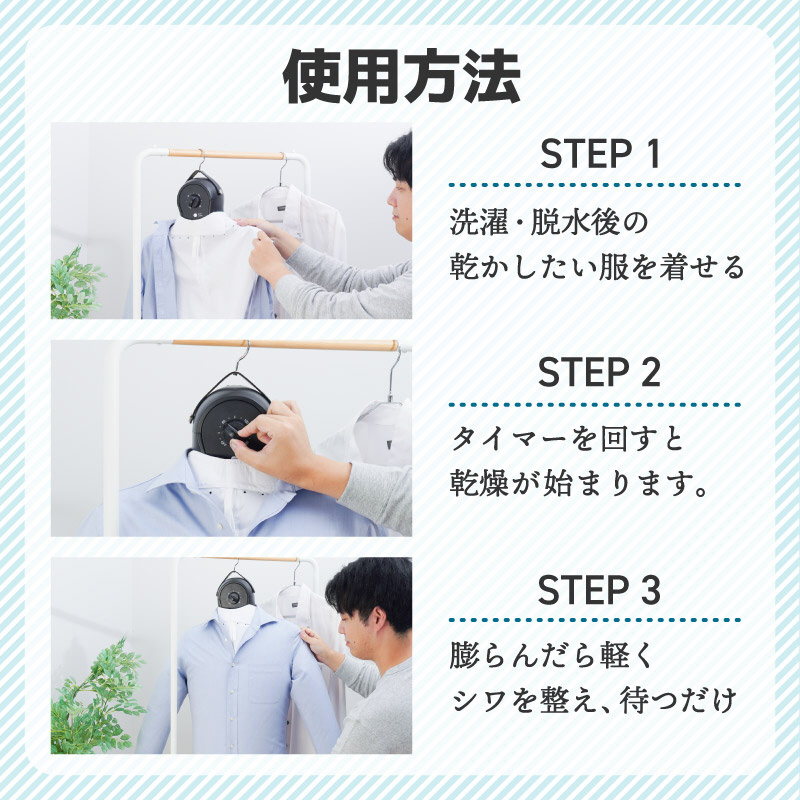 ●面倒なアイロンがけはもう不要!?ハンガー型でコンパクトな、シワが伸びる乾燥機