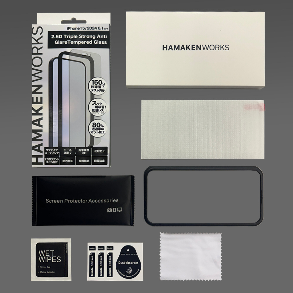 | 商品名 | 2.5D 3ストロング 反射防止保護ガラス for iPhone 15 Plus / 16 Plus ガイド枠付 HW-AGG16BPL |