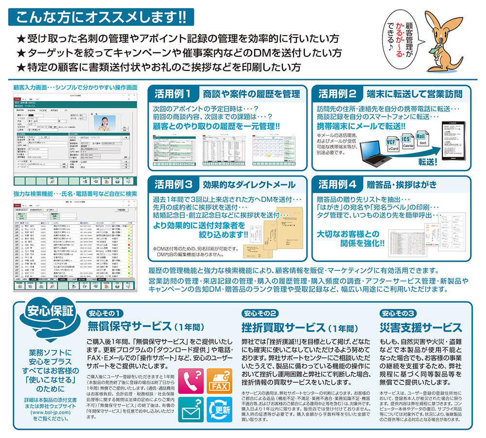 初めてでも顧客管理が簡単にできます。対応記録を管理できます。検索機能が充実しています。封筒・ハガキの宛名種類も豊富です。