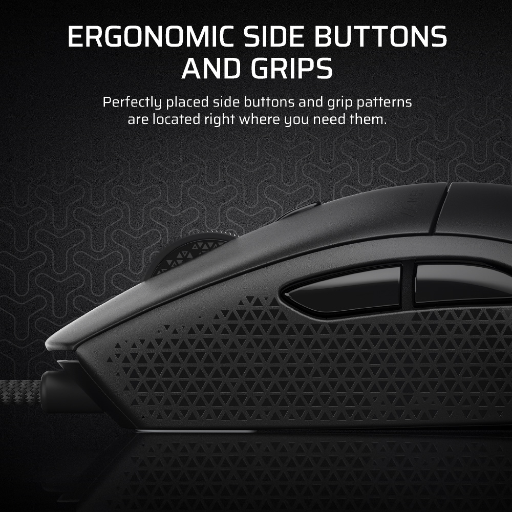 誰にも止められない力になろう。CORSAIR M55 ゲーミングマウスは、コンパクトな左右対称形状を採用し、持つ人の手のサイズやグリップスタイルにフィットします。わずか 55g で洗練されたスタイルの M55 は、デスクトップを軽々と駆け抜けます。マウスの光学センサーは最大 16,000 DPI に対応し、すべてのスイープとストップの高精度トラッキングが可能です。