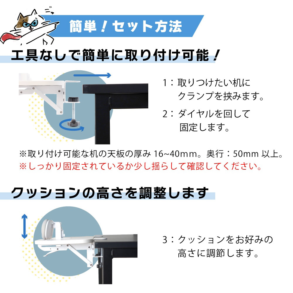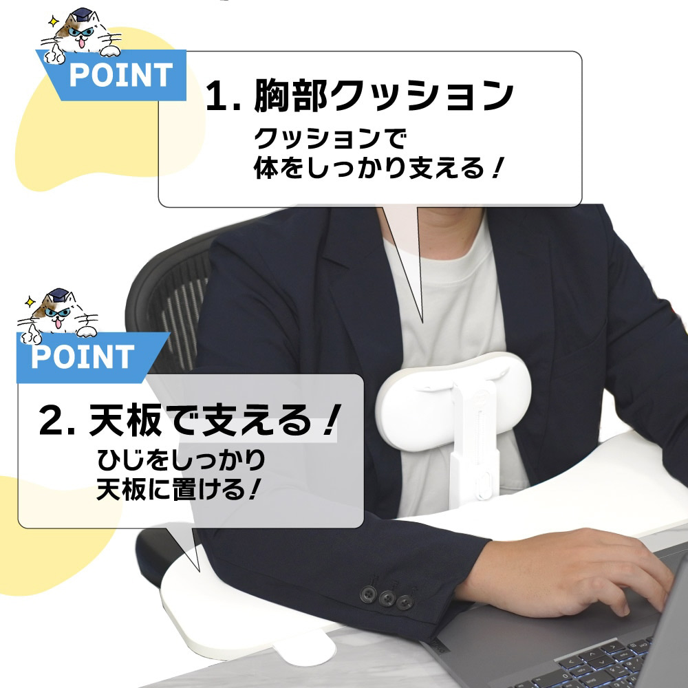両肘をしっかりサポート、長時間の作業でも猫背を防止!取りつけ簡単アームレストです。