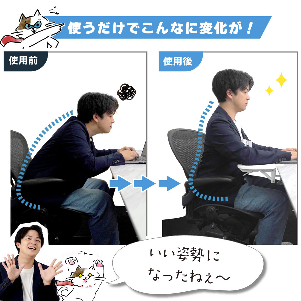 両肘をしっかりサポートし、長時間の作業でも猫背を防止! 快適なタイピングやマウス操作が可能です。
