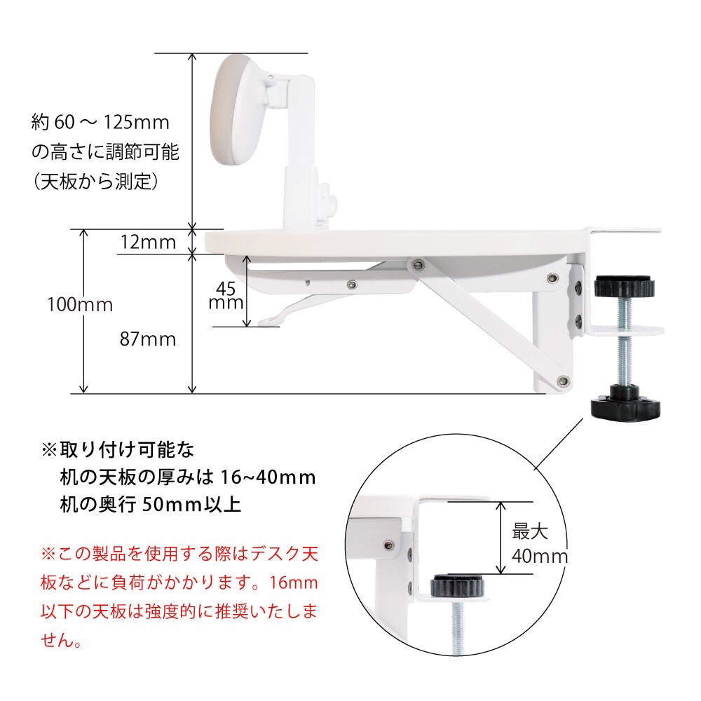 アームレスト [W680xD210xH160mm] 猫背を許さない!前傾防止 (クランプ式) ホワイト ARTPRFCWH