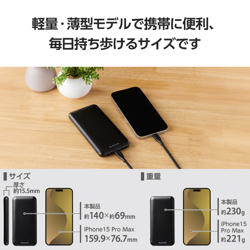 たっぷり使える10000mAhで長時間の外出時も安心。持ち運びしやすい薄型形状のモバイルバッテリーです。