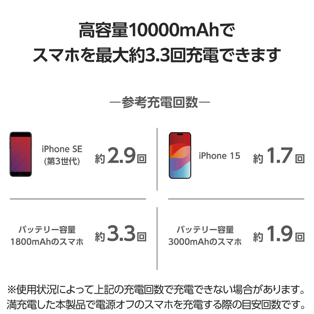 本製品(バッテリー容量10000mAh)で、1800mAhのスマートフォンを約3.3回、3000mAhのスマートフォンを約1.9回充電可能です。