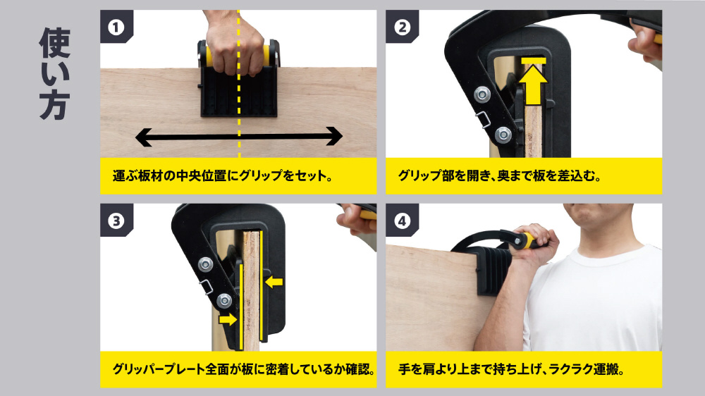 建設工事やDIYなどで持ち運びが辛い大判の板材が片手で楽に持ち運べます。