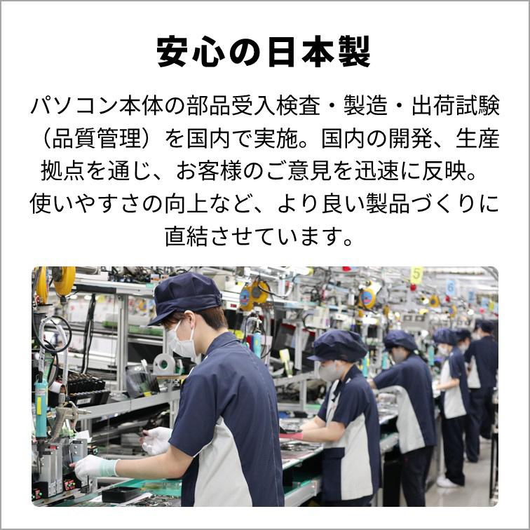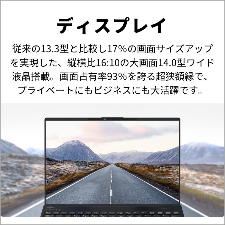 従来の13.3型と比較し17%の画面サイズアップを実現した、縦横比16:10の大画面14.0型ワイド液晶搭載。画面占有率93%を誇る超狭額縁で、プライベートにもビジネスにも大活躍です。