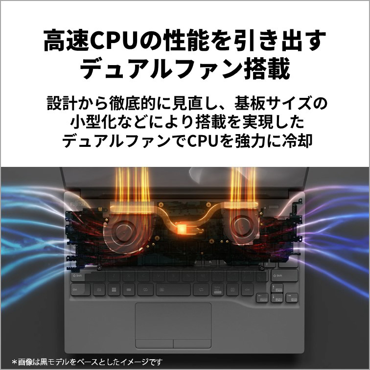 CPUを強力に冷却するデュアルファンを搭載することで28WのCoreUltra7-155Hの性能を引き出し、より快適な作業を行えます