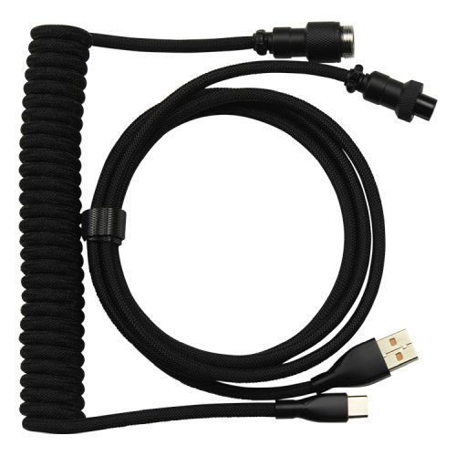 コイル型ケーブルをアビエイターコネクターでUSBケーブルと連結したキーボード、デバイス用ケーブルです。