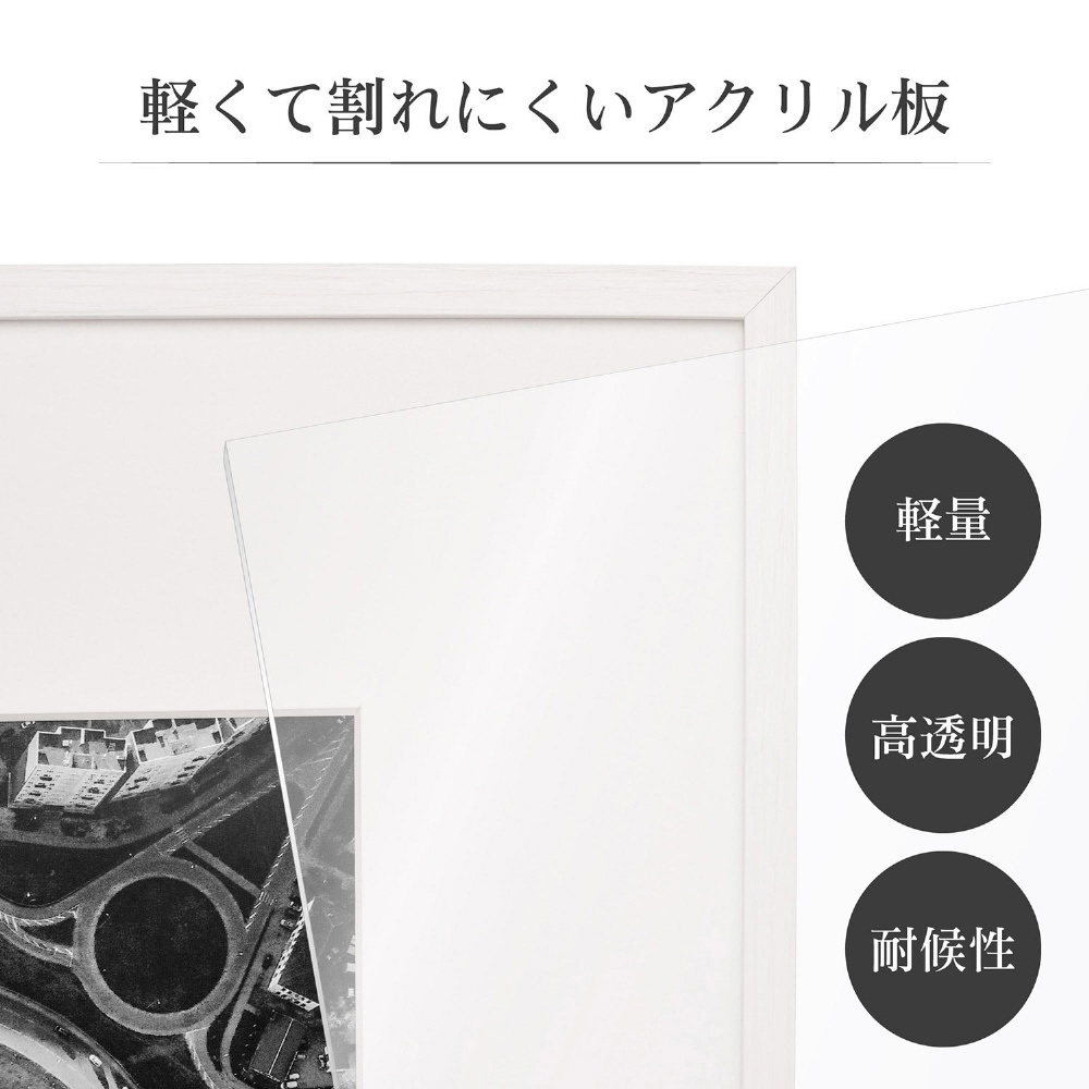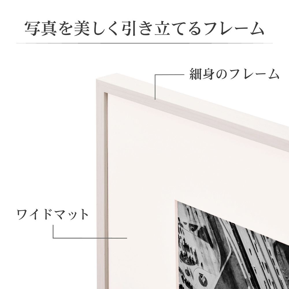 細身のフレームにVカットワイドマットが作品を引き立てる『軽くて割れないZEROフレーム』シリーズ。ひと回り大きな外形に、幅の広いワイドマットと、軽量で割れにくく透明度の高いアクリル板を採用したシリーズ上位モデルです。