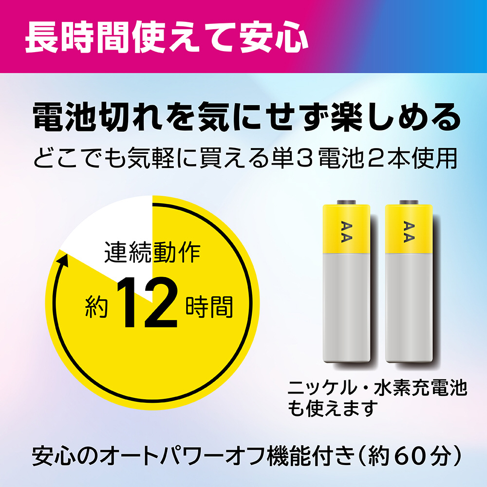 小型・軽量ボディーで、約12時間の手ブレ補正機能が使用可能。