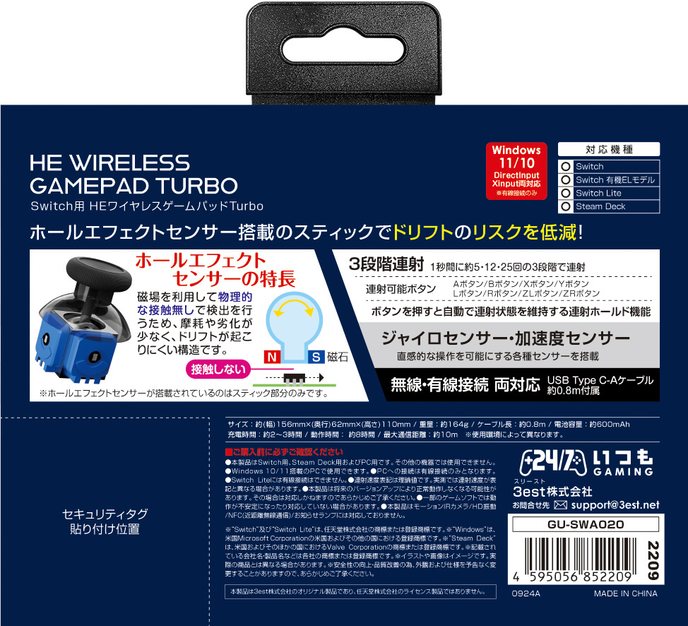 ホールエフェクトセンサー搭載Switch用ワイヤレスコントローラー