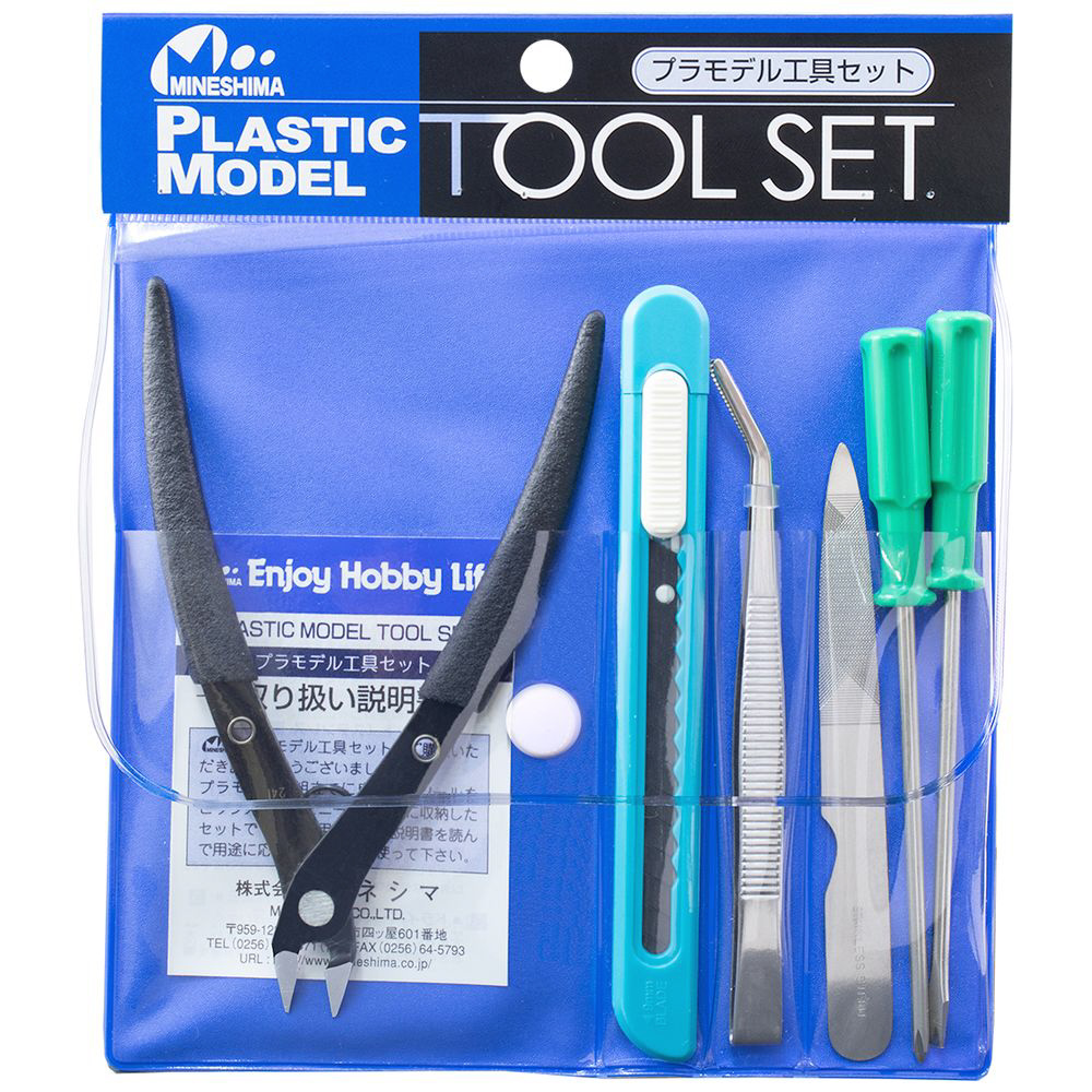 デカールなどをカットするカッターナイフや、自動車模型に使用するドライバーなど、プラモデルに必要な工具が揃った工具セット。(