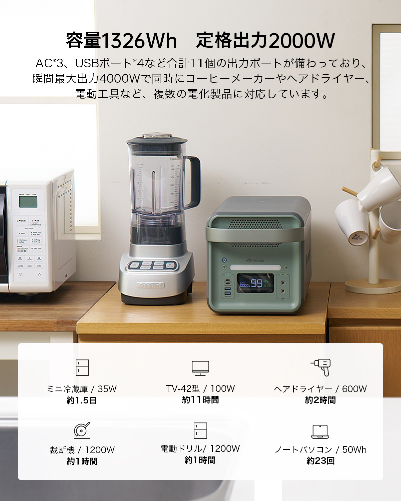 ・AC出力:2000W(定格)、4000W(瞬間最大)