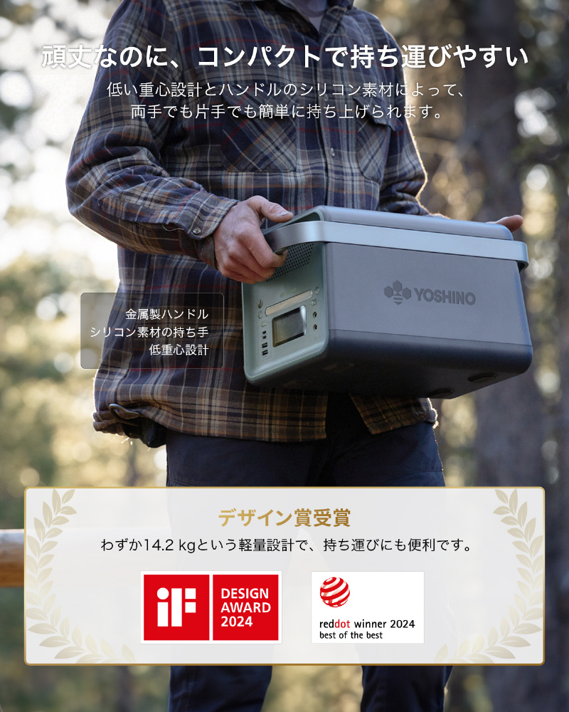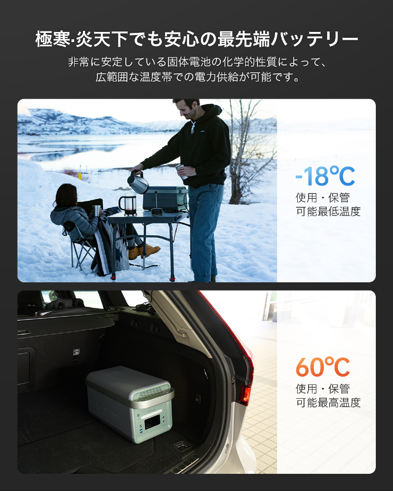 | 仕様1 | ■製品概要 ・バッテリータイプ:固体電池Li-NCM 16.2Ah ・容量:1326Wh、40.92V、32.4Ah ・AC出力:2000W(定格)、4000W(瞬間最大) ・重量:14.2kg ・寸法:445×218×231mm ・サイクル寿命:約4000回(初期容量の80%以上を維持) ・保証:5年 |