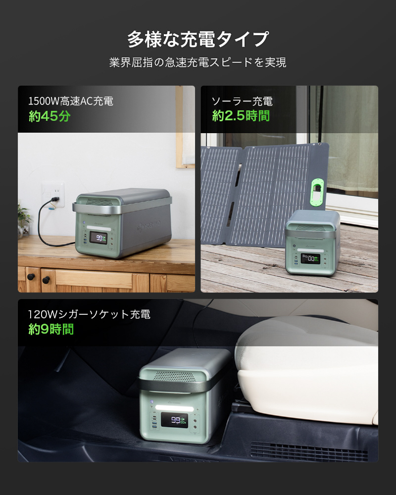 ■AC、シガーソケット、ソーラー充電と多様な充電方法。高速充電に対応しており、45分で80%まで高速充電。