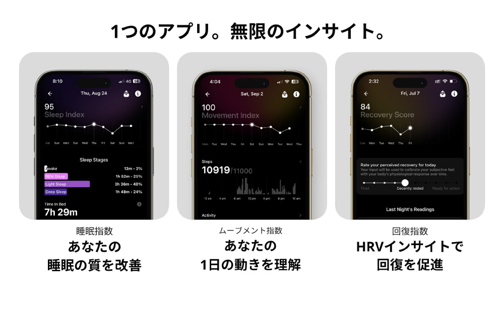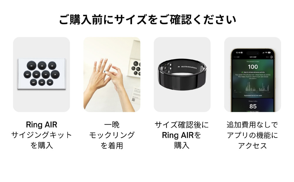 ・薄くて軽量: 一般的なウェアラブルより約11倍軽い・3つの解析: あなたのより良い健康のために、「睡眠」「リカバリー」「活動」を解析・月額費用無し: 月額利用料やサブスクリプション費用無しRing Airの購入のみでアプリも利用可能重さ約2.4g(世界最軽量級)