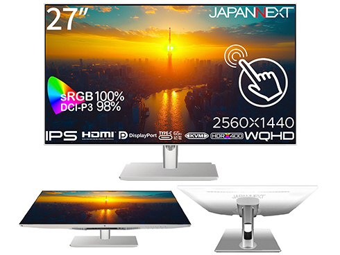 「27インチ IPSパネル搭載 10点マルチタッチ対応 WQHD(2560x1440)解像度 ホワイトカラー液晶モニター HDMI DisplayPort USB Type-C(最大65W給電) sRGB:100% DCI-P3:98% HDR400相当 多機能フラットスタンド搭載 ケーブル同梱(ホワイト)」