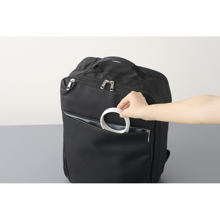 PC周りやリビングでのケーブル環境がスッキリ、さらにお出かけ時のバッグの中でのゴチャつきや、充電時のたわみ防止にも繋がる為、スマホなどの小型デバイスと一緒に持ち運ぶのに最適。