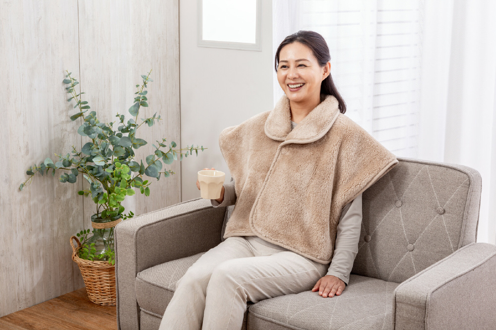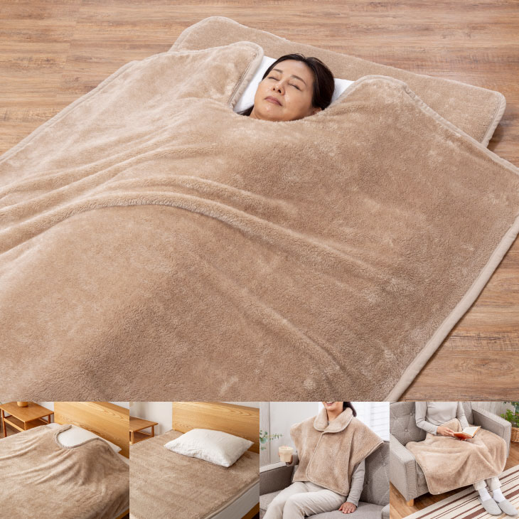 ●吸湿発熱素材のくりえり毛布、敷パッド、肩当て、ひざ掛けまで揃った充実のセット。