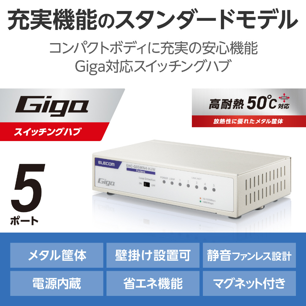 本体サイズを従来機種(※)より33%小型化し、省スペースに設置可能なコンパクトモデル。ファンレスで耐熱50℃に対応し、ループ検知機能も搭載したGiga対応、電源内蔵のメタル筐体5ポートハブです。 ※従来機種:EHC-G05MN2-HJW