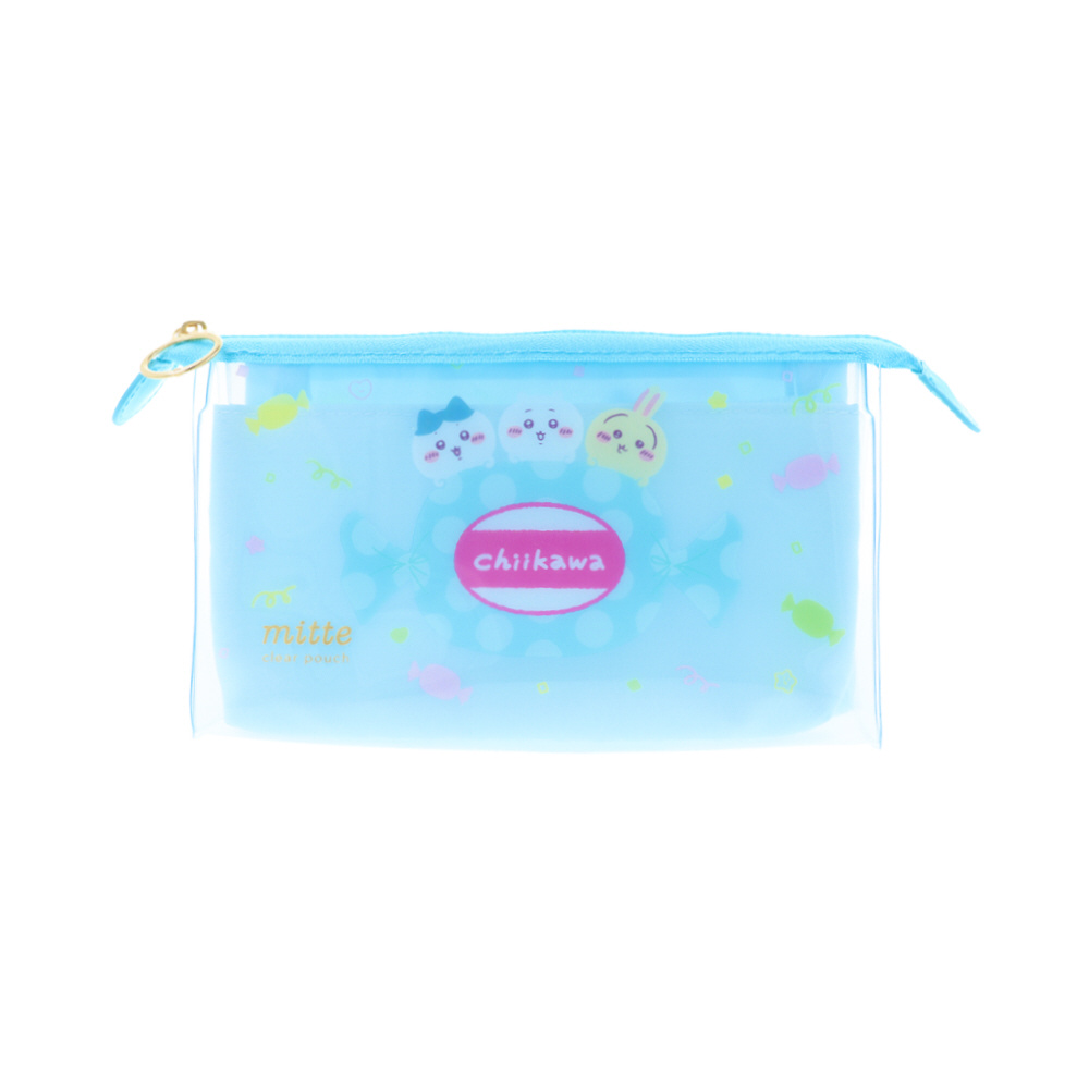 見せたい物は手前に、隠したいものはポケットに収納して、綺麗に『魅せる』、「クリアポーチ マチ mitte」。柄は、ちいかわ。デザインは、ちいかわ・ハチワレ・うさぎ。