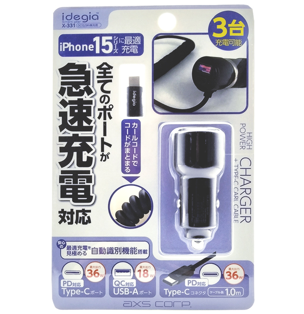 | 商品名 | ダイレクト DC2ポート充電器 C+A カールコード idegia ブラック X-331 |