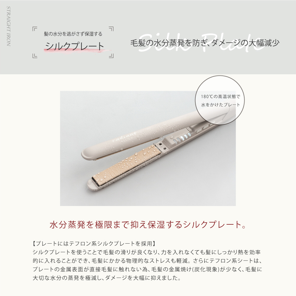 ●プレートにはテフロン系シルクプレートを採用、シルクプレートを使う事で、毛髪の滑りが良くなり、力を入れなくても髪にしっかり熱を効率的に入れることができ、毛髪にかかる物理的なストレスも軽減。さらにテフロン系シートは、プレートの金属表面が直接毛髪に触れない為、毛髪の金属焼け(炭化現象)が少なく、毛髪に大切な水分の蒸発を極減し、ダメージを大幅に抑えました