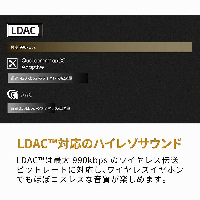 LDAC TMは最大990kbpsのワイヤレス伝送ビットレートに対応し、ワイヤレスイヤホンでもほぼロスレスな音質が楽しめます。