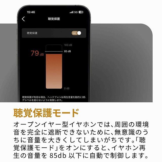 「聴覚保護モード」をオンにすると、イヤホン再生の音量を85db以下に自動で制御します。