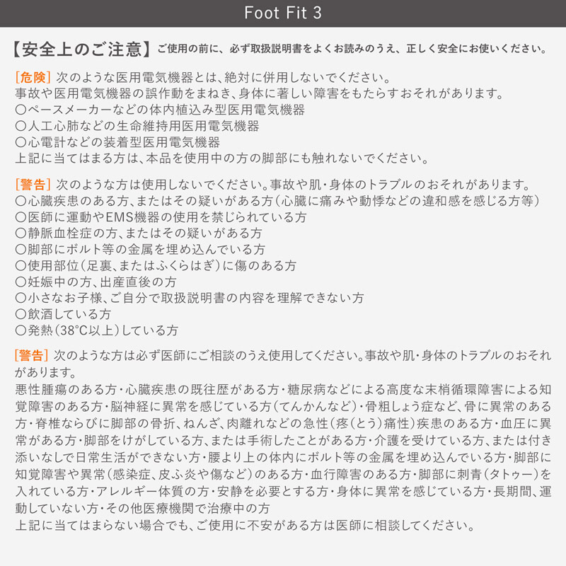 | 仕様1 | Foot Fit 3は電池式、Foot Fit 3 Heatは充電式です。 |