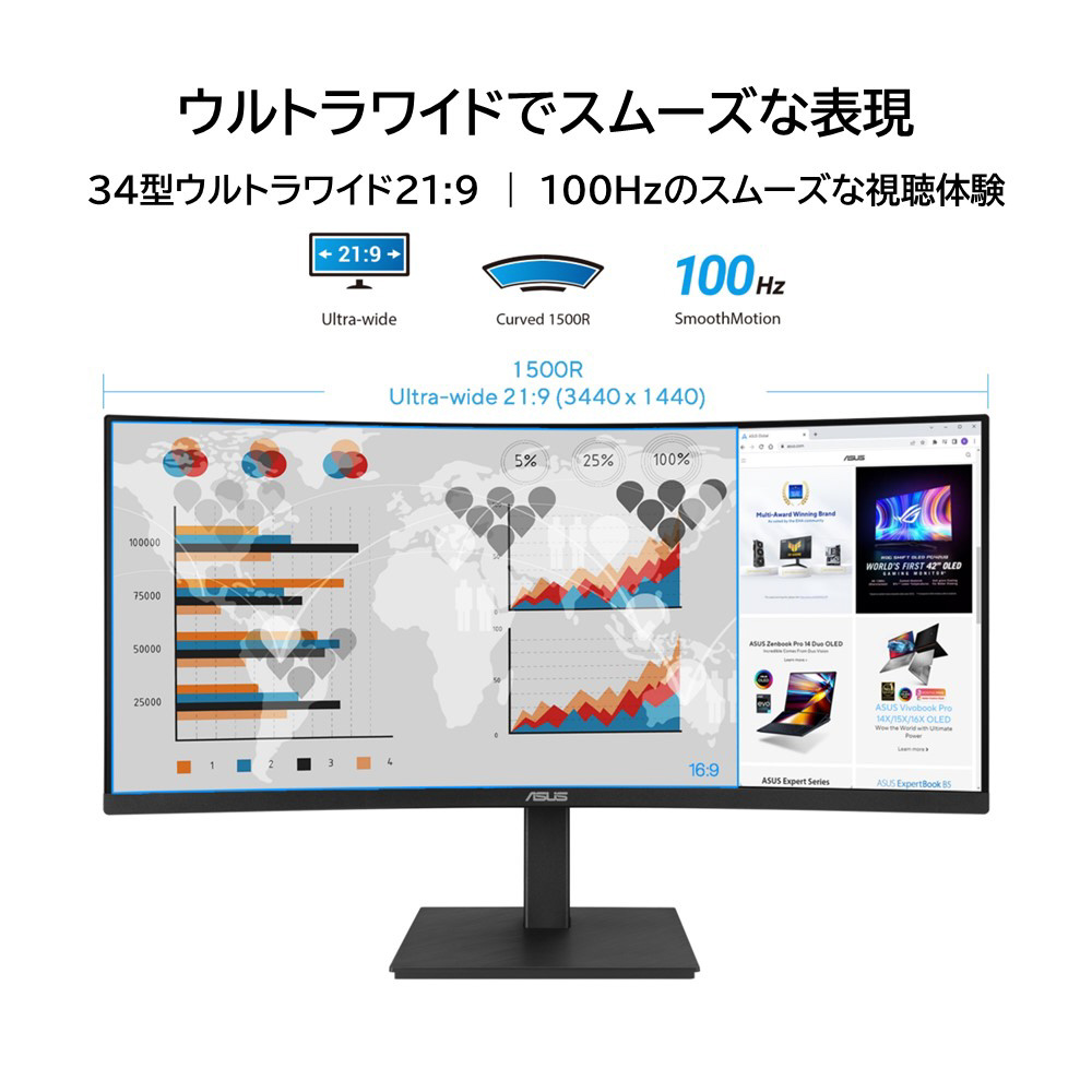 34型ウルトラワイド 21:9(3440×1440)曲率1500R、178°広視野角パネル