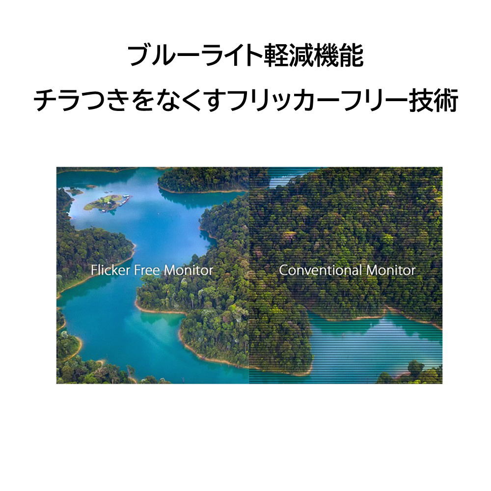 フリッカーフリー技術は、画面のちらつきを抑え、長時間使用でもより快適な環境を提供します。ディスプレイの前で長時間過ごす際の眼精疲労、頭痛、目の疲れを最小限に抑えるように設計されています。