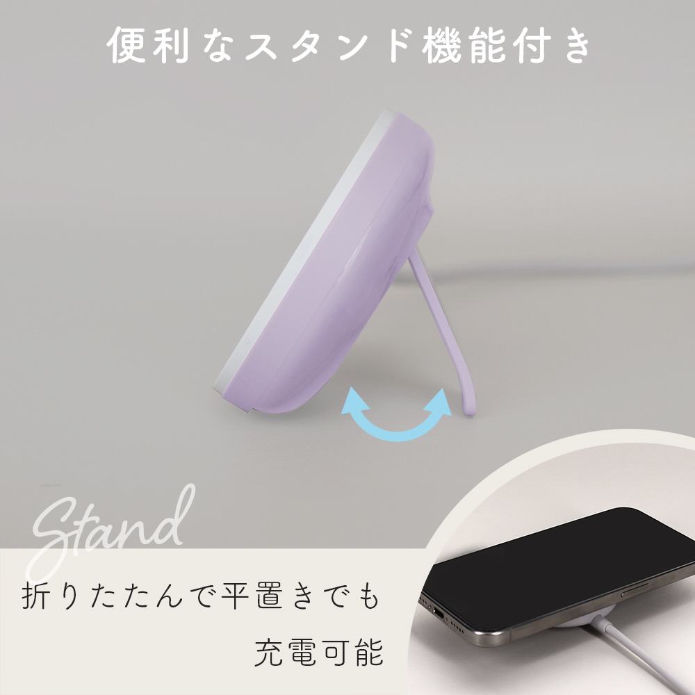収納式スタンド付き。スマートフォンをタテ・ヨコにスタンドすることができるので、ワイヤレス充電をしながら、動画視聴、ゲーム、テレビ電話などができます。スタンドを収納してフラットにすれば、平置きした状態での充電もできます。※お使いの機種サイズによって縦向きに使用すると不安定になる場合がございます。