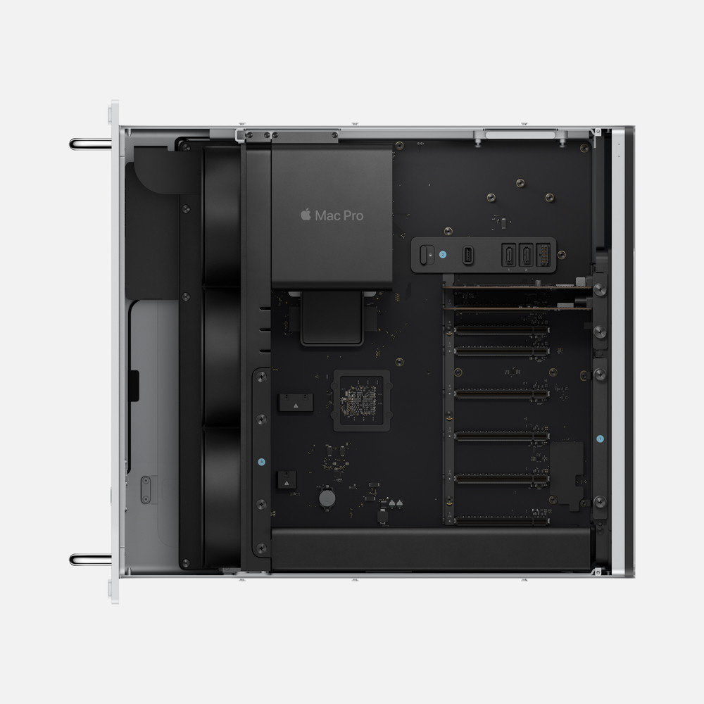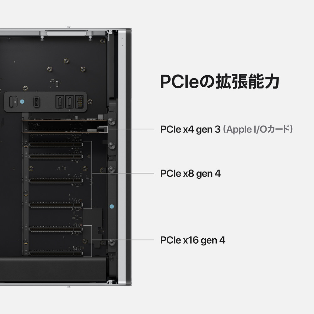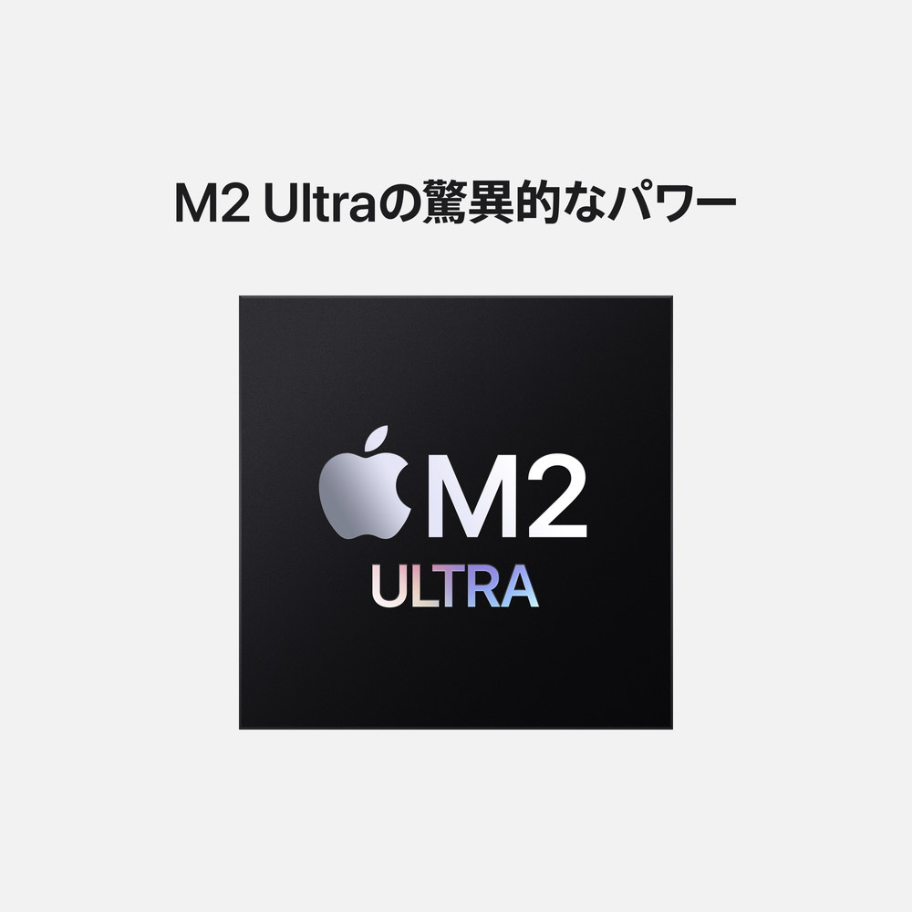常識を超えるパフォーマンスを標準装備。 Mac Proは、AppleシリコンのパフォーマンスとPCIeの拡張能力を融合させるイノベーションを実現。プロのワークフローにふさわしいMacです。そして、すべての構成でM2 Ultraを搭載。これはApple史上最も大きく、極めて高性能なチップです。