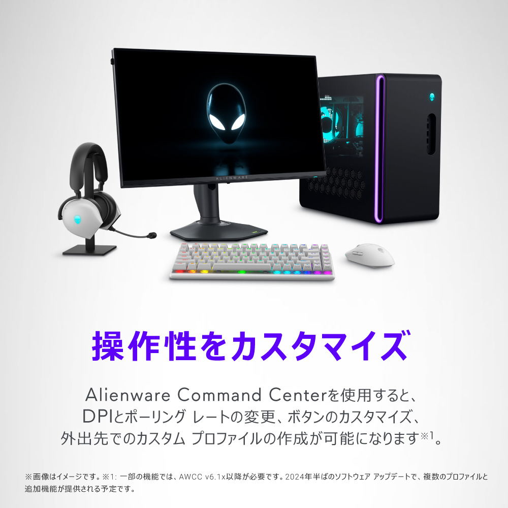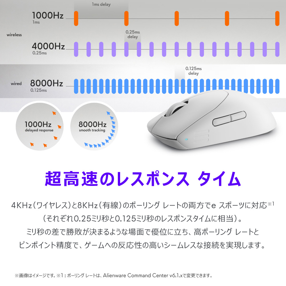 4KHz(ワイヤレス)と8KHz(有線)のポーリング レートの両方でe スポーツに対応※1(それぞれ0.25 ミリ秒と0.125 ミリ秒のレスポンスタイムに相当)。ミリ秒の差で勝敗が決まるような場面で優位に立ち、高ポーリング レートとピンポイント精度で、ゲームへの反応性の高いシームレスな接続を実現します。※1:ポーリング レートは、Alienware Command Center v6.1.xで変更できます。