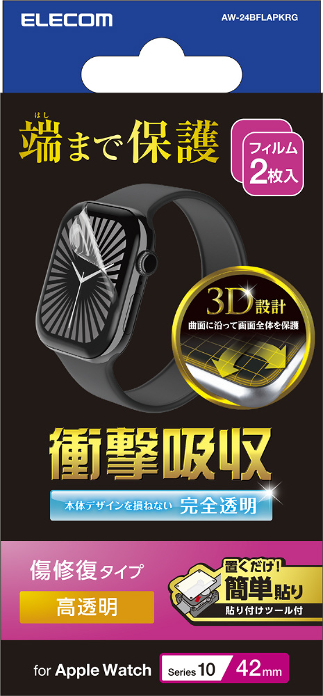 フィルム表面に付いた細かい傷が時間の経過とともに自然と目立たなくなる特殊フィルムを採用した、衝撃吸収、傷リペア、指紋防止タイプのApple Watch用フルカバーフィルムです。貼り付けの際に、ずれやすいフィルムをぴったりと位置合わせできる貼り付けツール付きです。