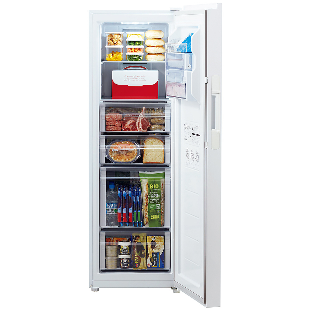 ドアを開けると全体が見渡せるタテ型タイプ。中が見えるクリアバスケットは、整理しやすく取り出しやすい引き出し式です。