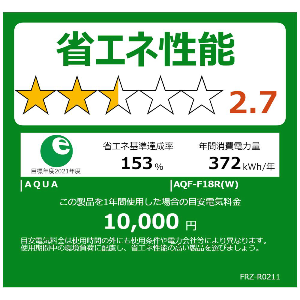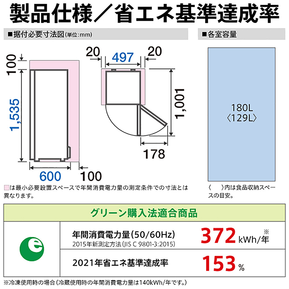 | 年間消費電力量 | 372kWh/年(JIS C 9801-3:2015) |