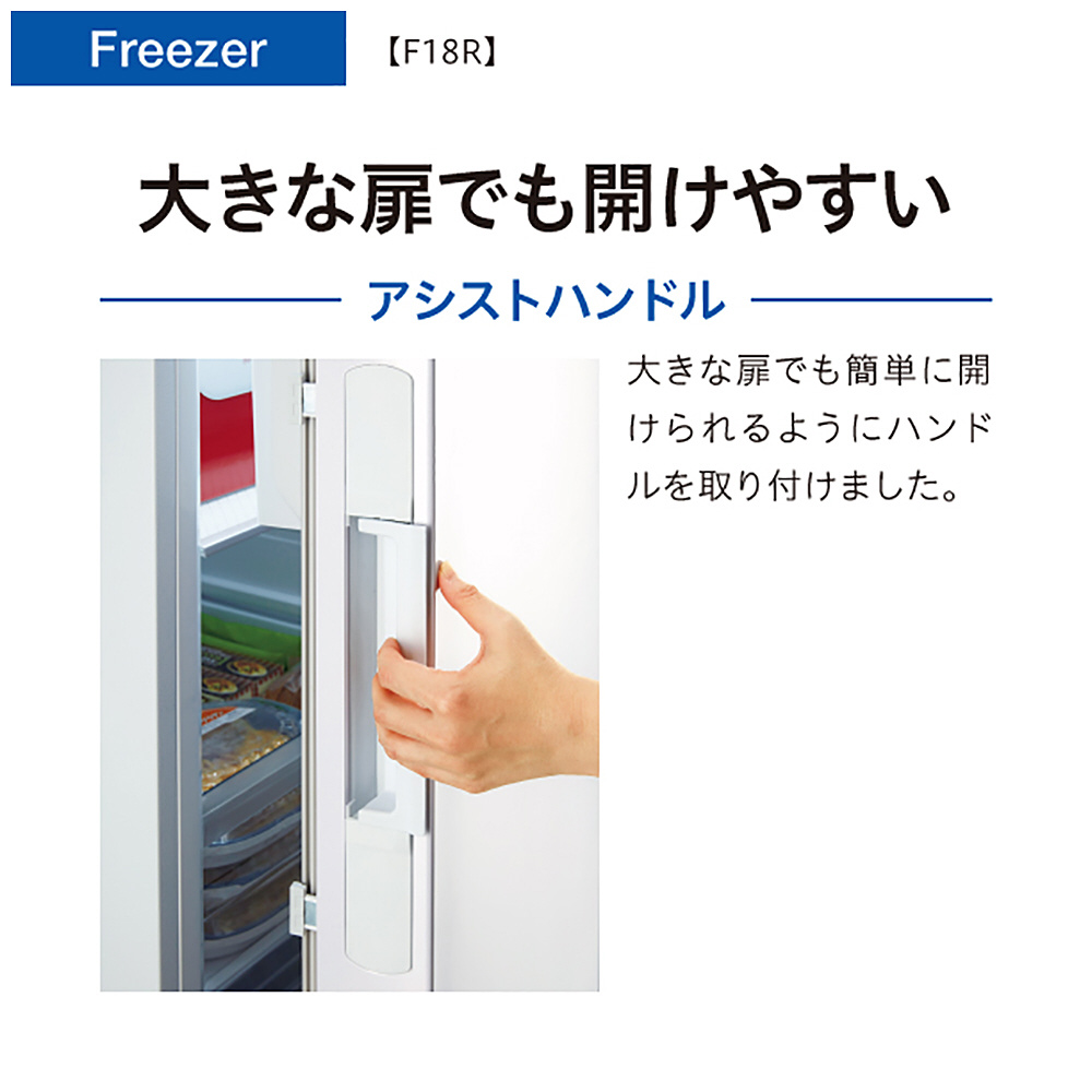 省エネ効率も備えた幅50cmクラス、大容量180L。高さのある食材も収納可能な大きな引き出し。製氷ユニット、扉開閉アシストハンドル。