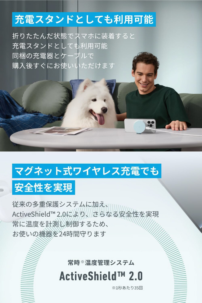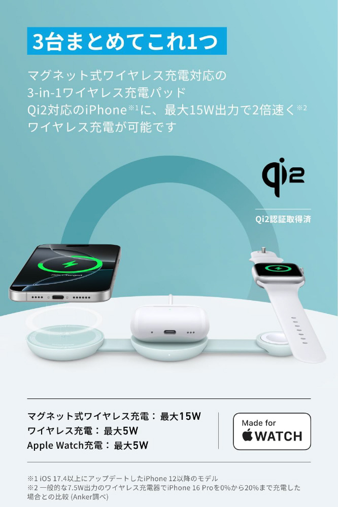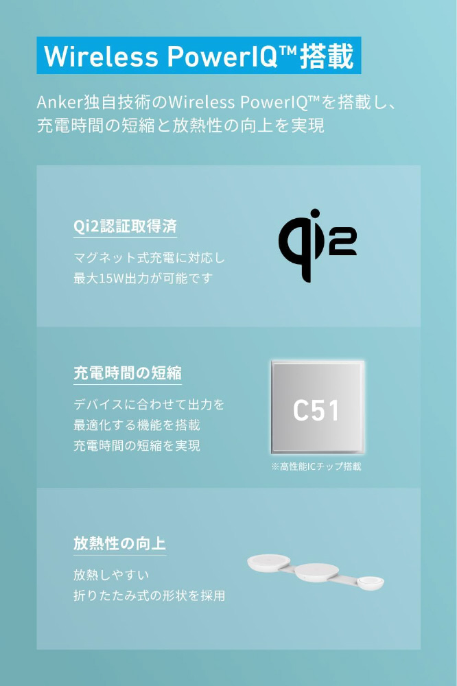 ワイヤレス充電スタンド Anker MagGo Wireless Charging Station(3-in-1、Foldable Pad) ミントブルー B25M8N61 [ワイヤレスのみ /15W]