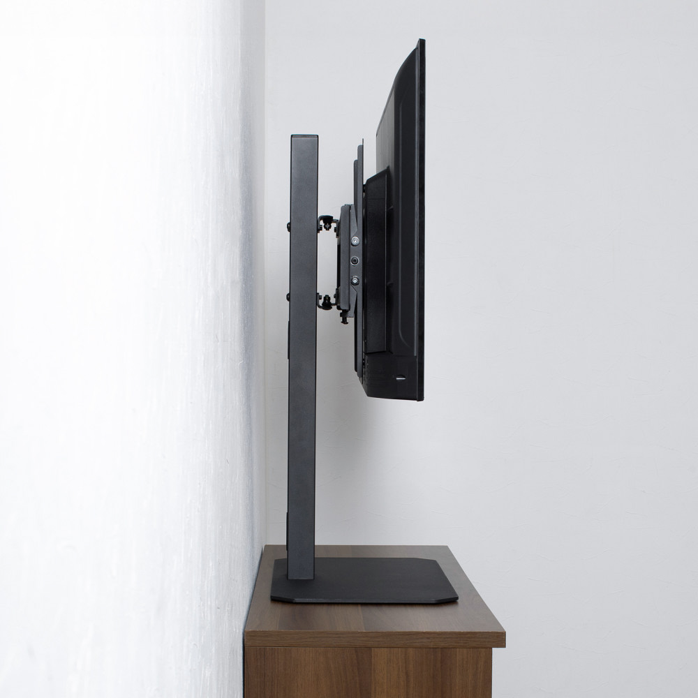 上下左右の角度調整と3段階の高さ変更が可能なスチール製卓上テレビスタンド。
