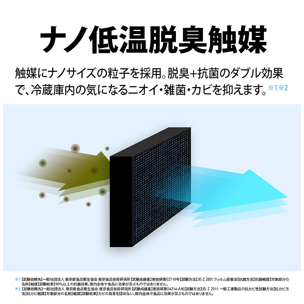 触媒にナノサイズの粒子を採用。脱臭+抗菌のダブル効果で、気になるニオイ・雑菌・カビを抑えます。