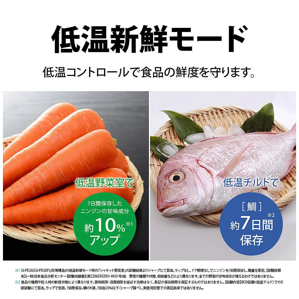 チルドルームでは生鮮食品の鮮度低下を抑えて、鯛なら約7日間保存。人参を野菜室で約7日間保存した場合、甘み成分が約10%アップします。