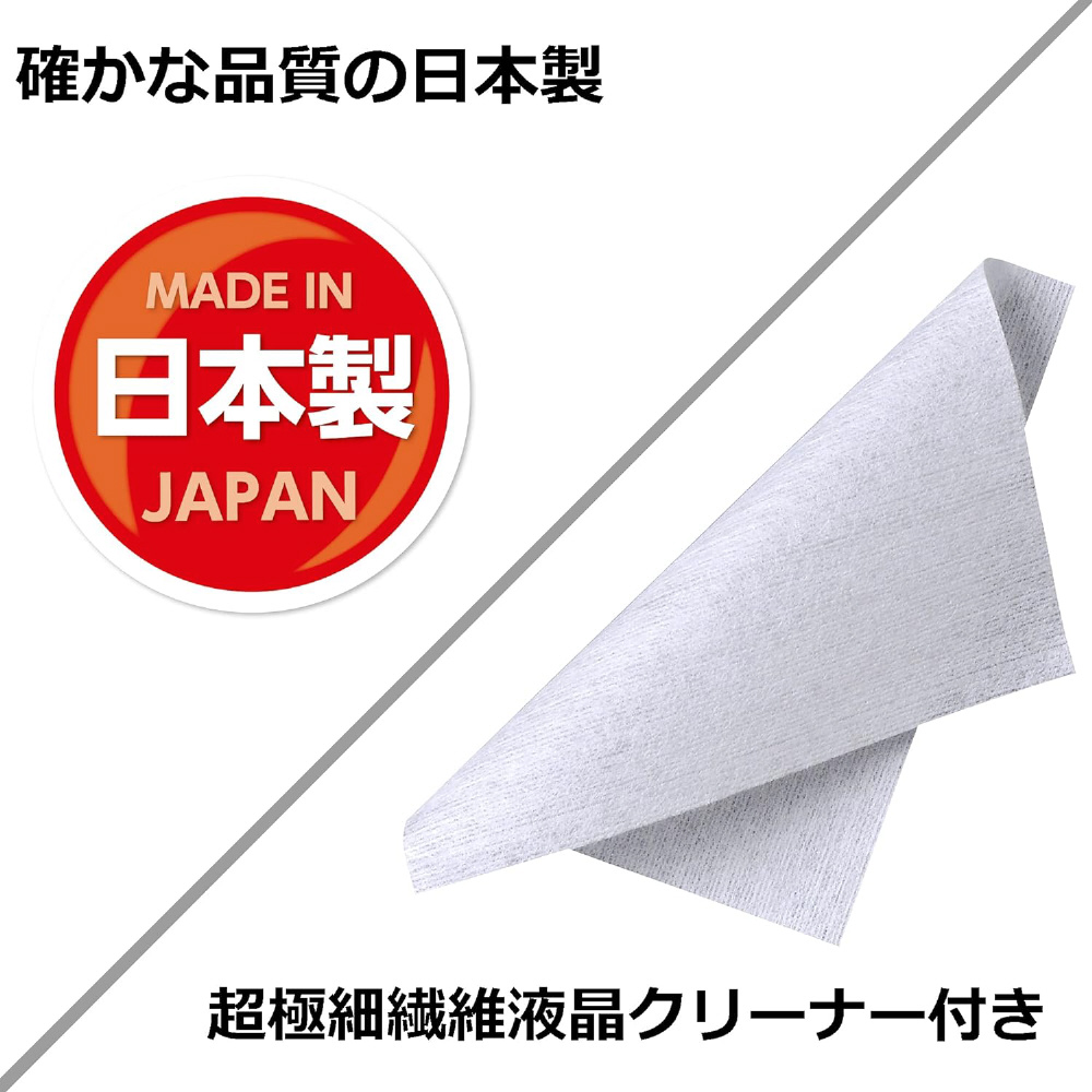表面には撥水、指紋防止、抗菌、ハードコート加工、粘着面はバブルレスタイプを採用。