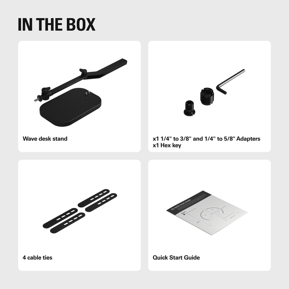 コンパクトで非常に柔軟性のあるWave Desk Standは、あらゆる平らな面に機材を完璧に配置するのに役立ちます。最大1kgまで対応可能で、重量のあるマイクにも十分耐える頑丈さを備えながら、移動や調整も簡単です。