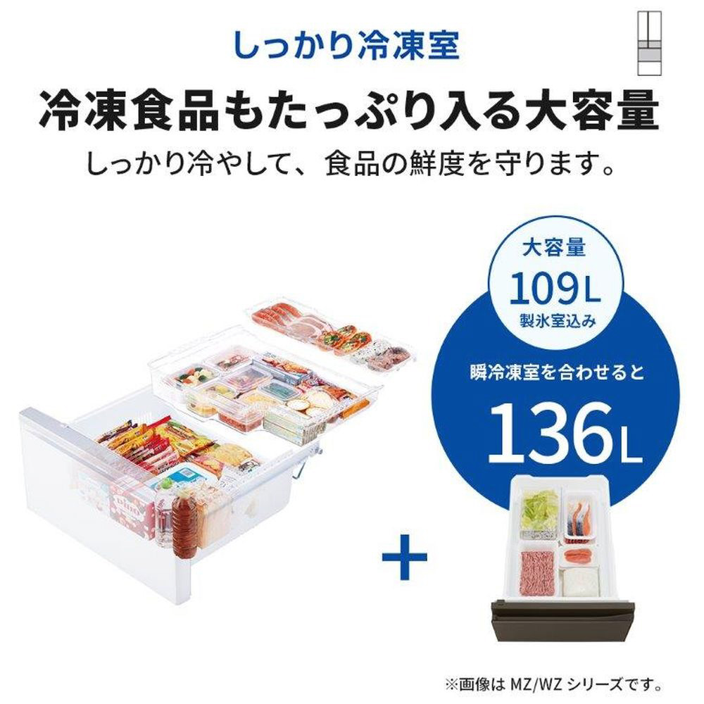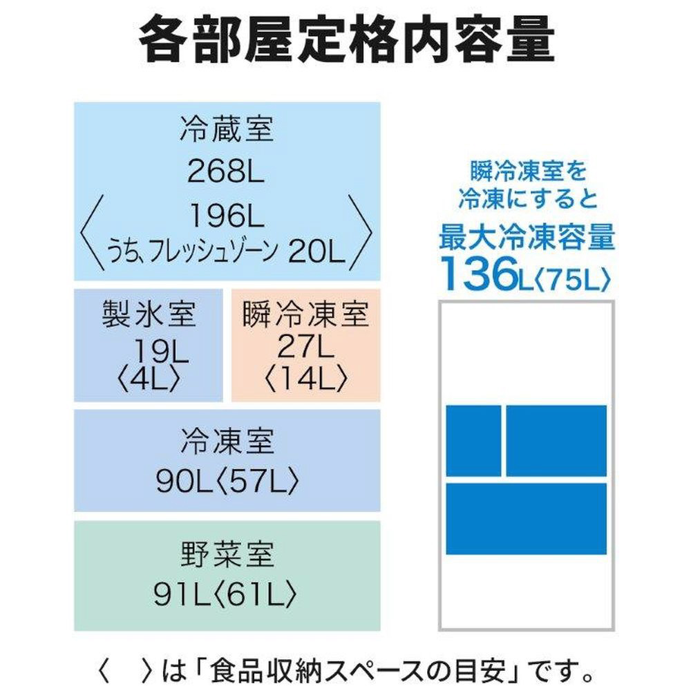 | 仕様1 | 食品収納スペースの目安 ・冷蔵室: <196L> ・うち、フレッシュゾーン: <23L> ・製氷室: <4L> ・瞬冷凍室: <14L> ・冷凍室: <57L> ・野菜室: <61L> |