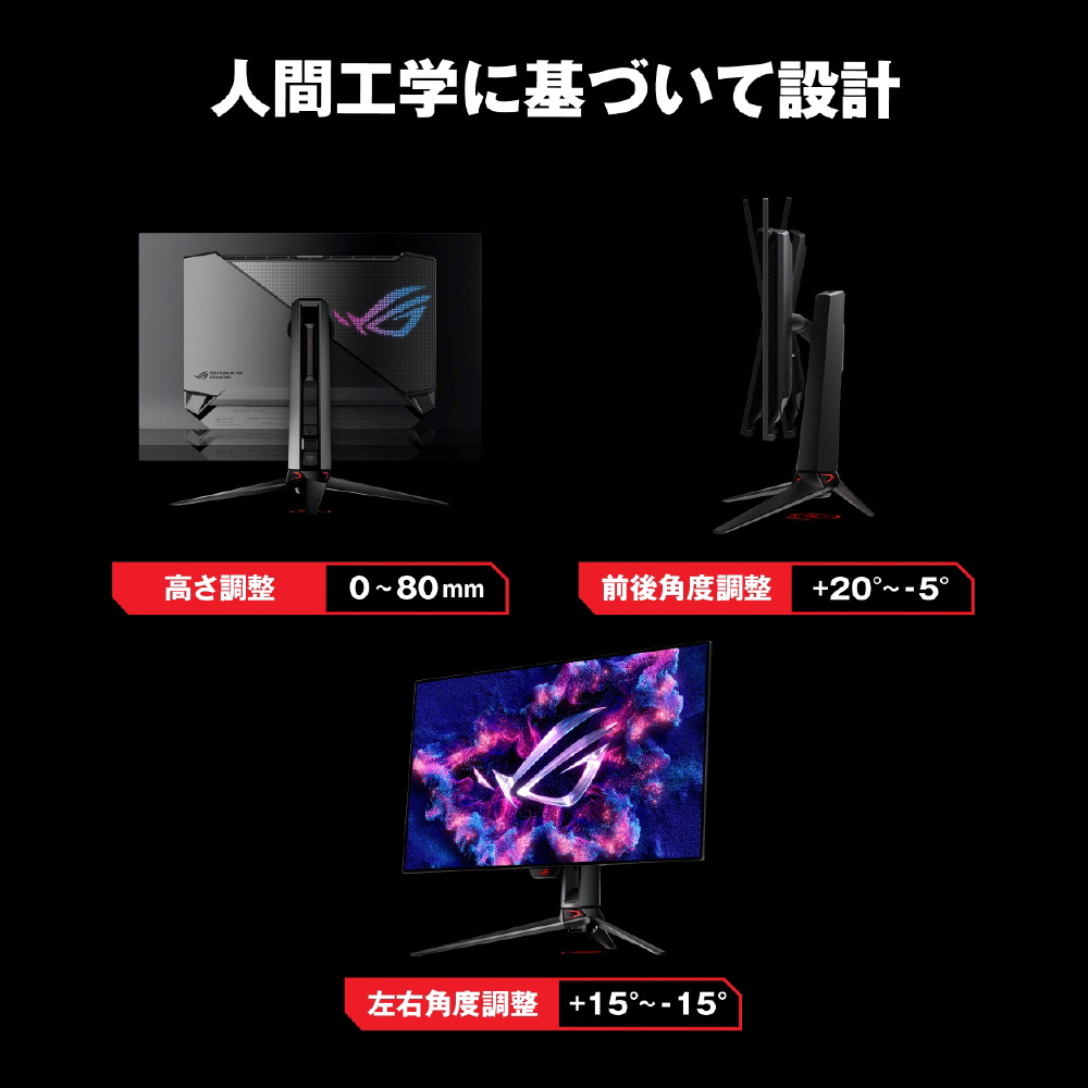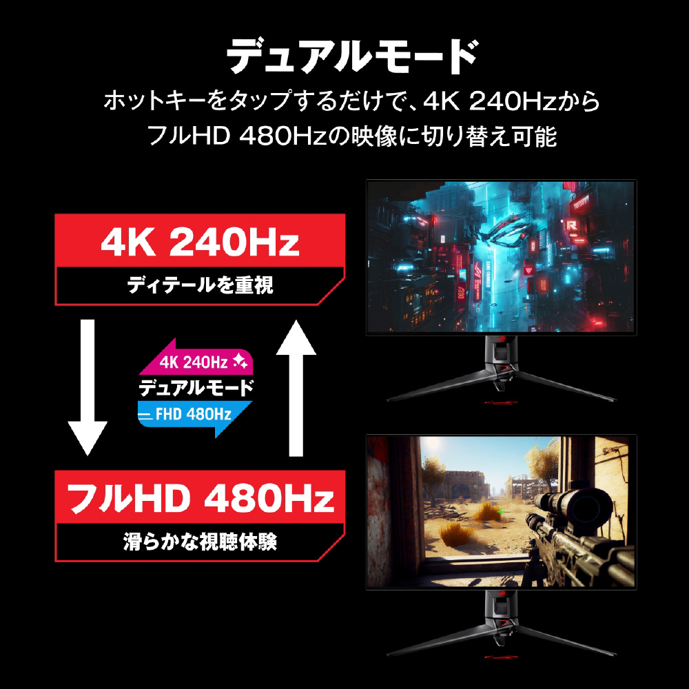 4K @ 240 HzとFHD @ 480 Hzの映像を切り替えることができます。第3世代のROG 有機ELテクノロジーにより、鮮やかな色彩、最も深い黒、そして最も明るいハイライトを実現します。また、0.03ms(GTG)応答速度により、激しいゲームプレイ中でもブレのないアクションが保証されます。
