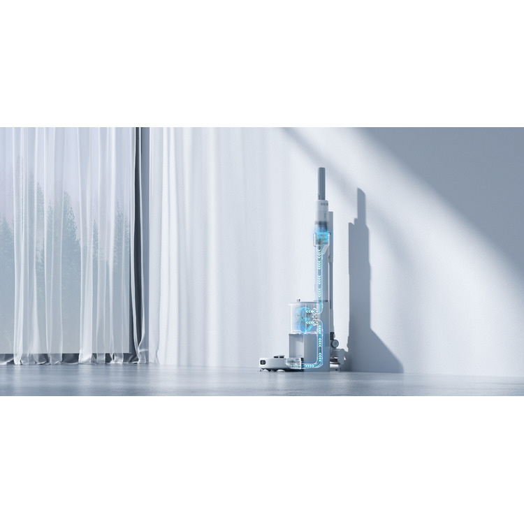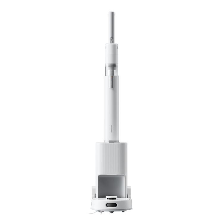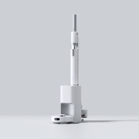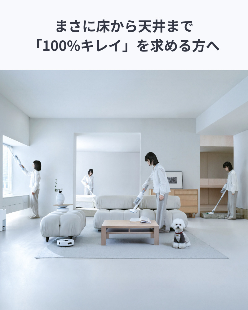 ロボット+スティックが1つのステーションに。A4サイズにすっぽり収まる省スペース設計で、家まるごとのお掃除を「これ1台」で完結。